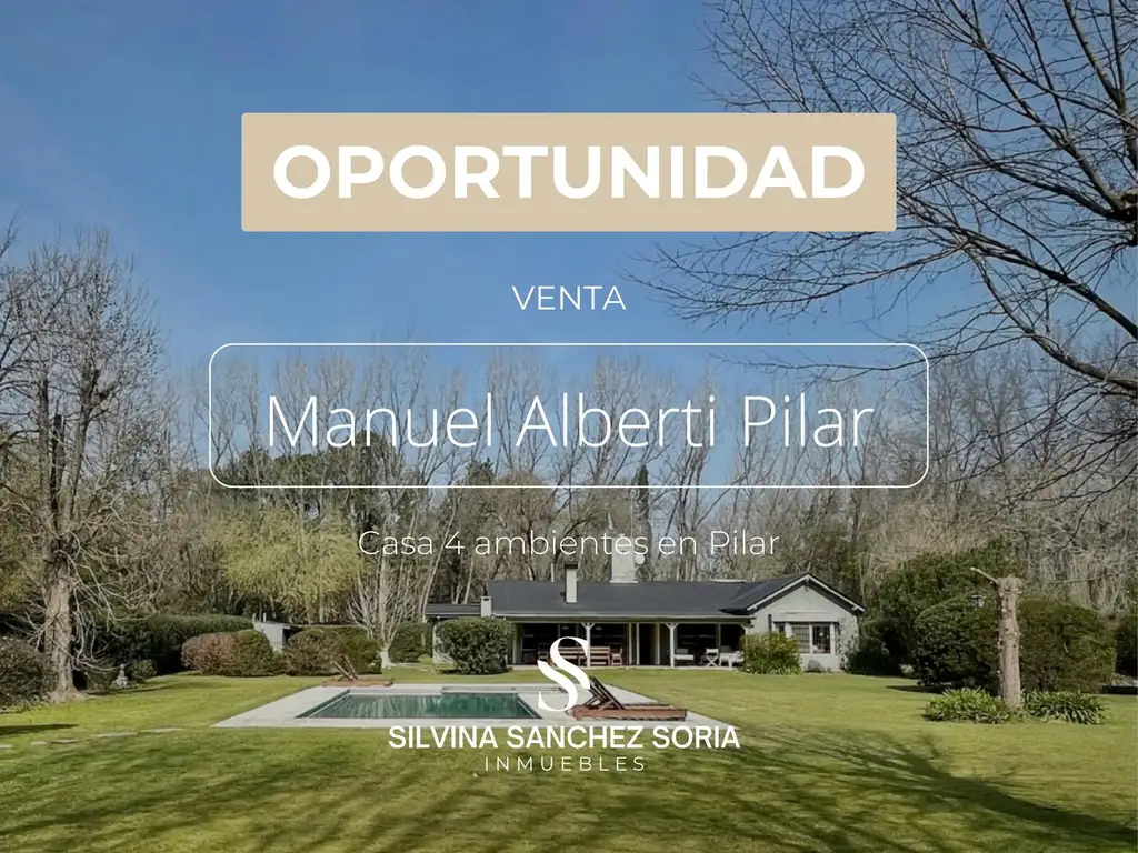 APTA CRéDITO. Hermosa propiedad sobre un terreno de 3.700 m2, ubicada en una zona residencial de Manuel Alberti, próxima a reconocidos barrios cerrados como Country San Pablo, La Delfina, colegios de prestigio, shopping Palmas de Pilar, Torres del Sol y a pocos minutos del Hospital Austral y supermercados Mayoristas, del Km 50 de Pilar.