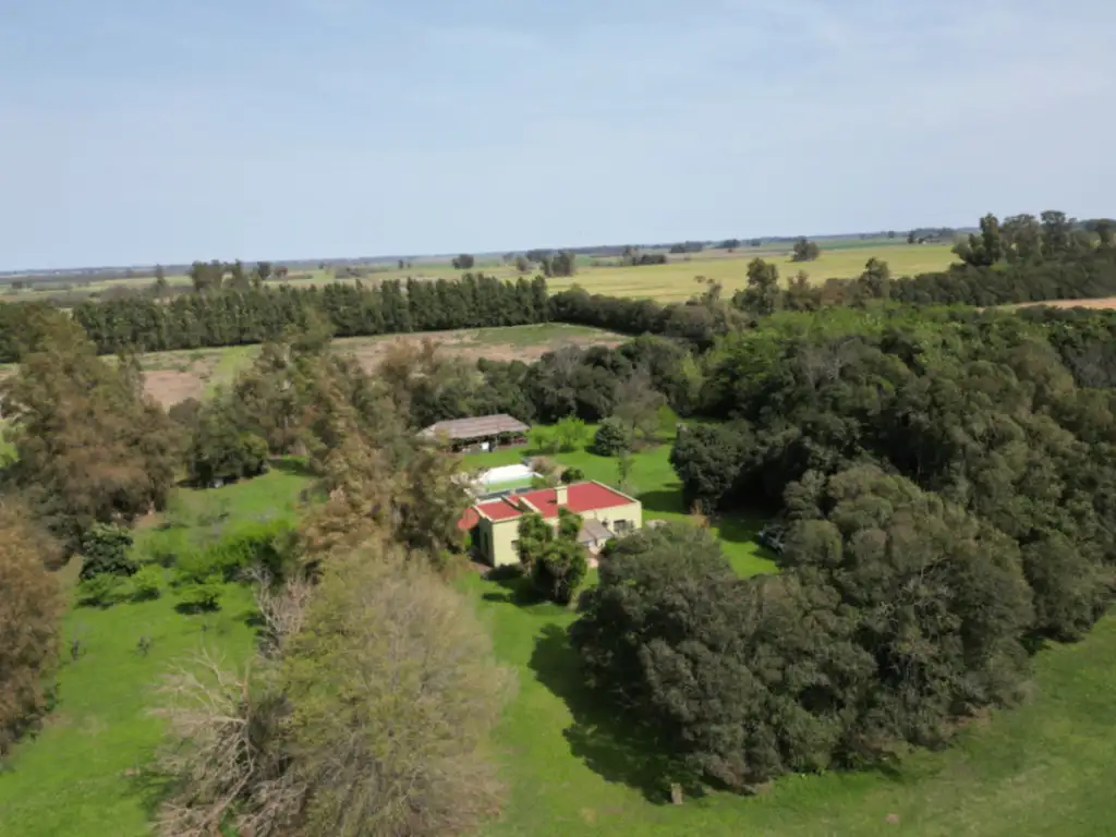 Quincho abierto de 5 mts. por 15 mts. con techo de paja, pisos de madera e instalación eléctrica. Añosa y variada arboleda en la parte del casco.