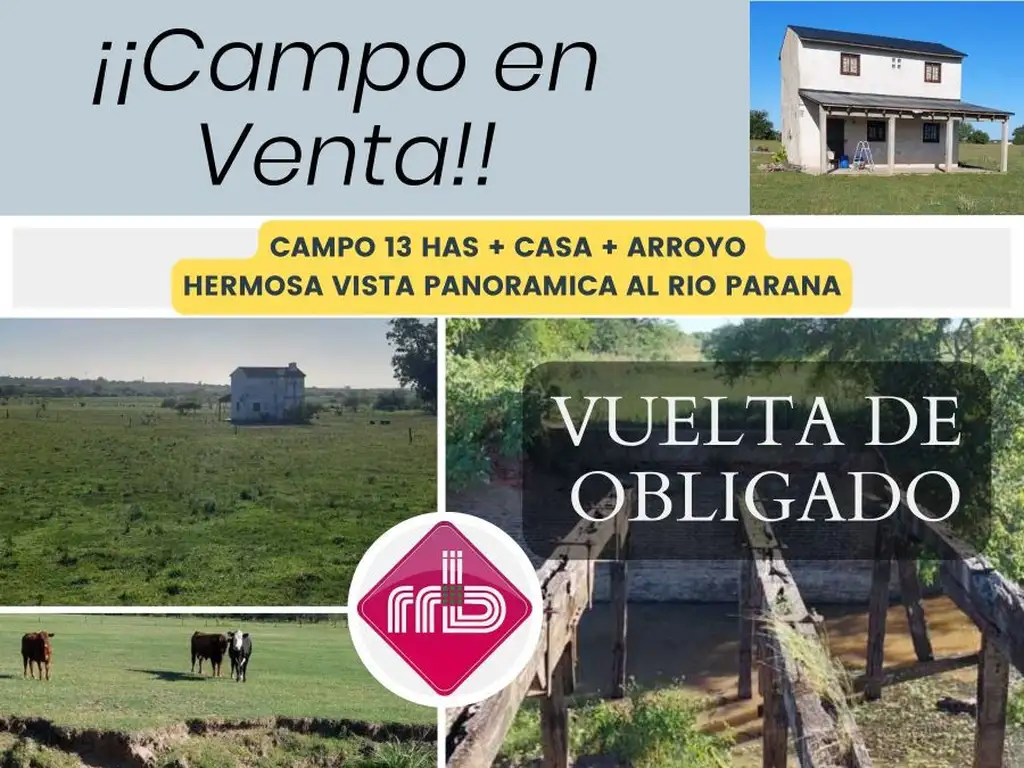 * * Disponemos para la venta un hermoso Campo de 13 Hectáreas con la mejor vista panorámica al Rio Paraná, sobre esta propiedad atraviesa un preciado arroyo en el cual se puede pescar varios ejemplares y nos podemos resguardar en una cómoda casa de dos plantas las cuales suman un total de 80m2 cubiertos.