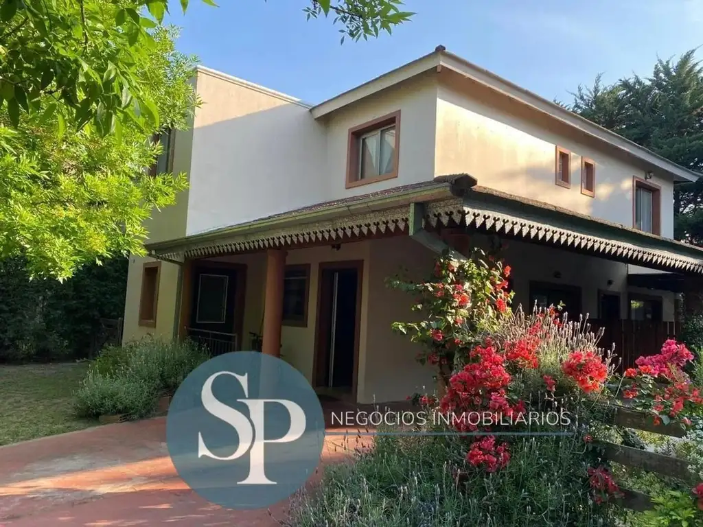 Exterior: Galería semicubierta con parrilla, jardín totalmente parquizado y piscina con playa húmeda, cochera cubierta para 2 autos.