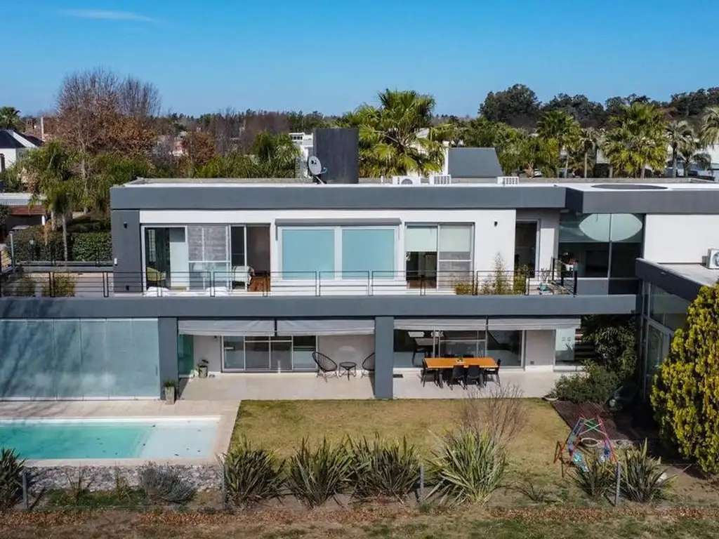 Ingreso principal en doble altura con hermoso hall completamente vidriado lo que le otorga gran luminosidad y amplitud a la casa incorporando la naturaleza a los ambientes, generoso living con amplia vista al jardín y a la piscina mediante ventanales de doble altura, equipado con chimenea a gas, comedor principal al frente muy luminoso con baño de recepción.