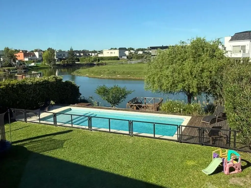 Casa en alquiler. 5 ambientes desarrollada en dos plantas, sobre lote a la laguna de 725 m2. Superficie total de 273 m2, de los cuales 228 m2 son cubiertos y 45 m2 semicubiertos.