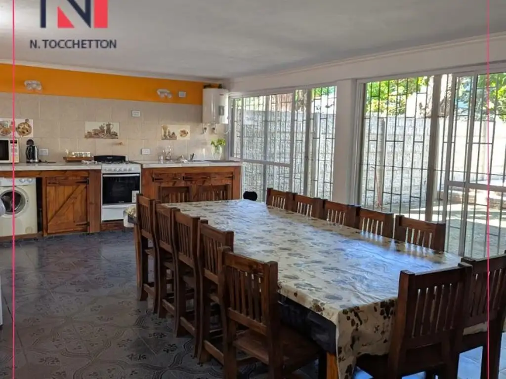 Ingresamos a la propiedad donde tenemos el living cocina comedor integrado con hermosa vista al parque por tener totalmente vidriado su frente lo que lo hace muy luminoso y con excelente ventilacion, cuenta con una mesa y sillas para 14 pesonas, mesada con bacha y griferia monocomando, heladera y lavarropas en el bajo mesada, mueble de guardado, baño completo