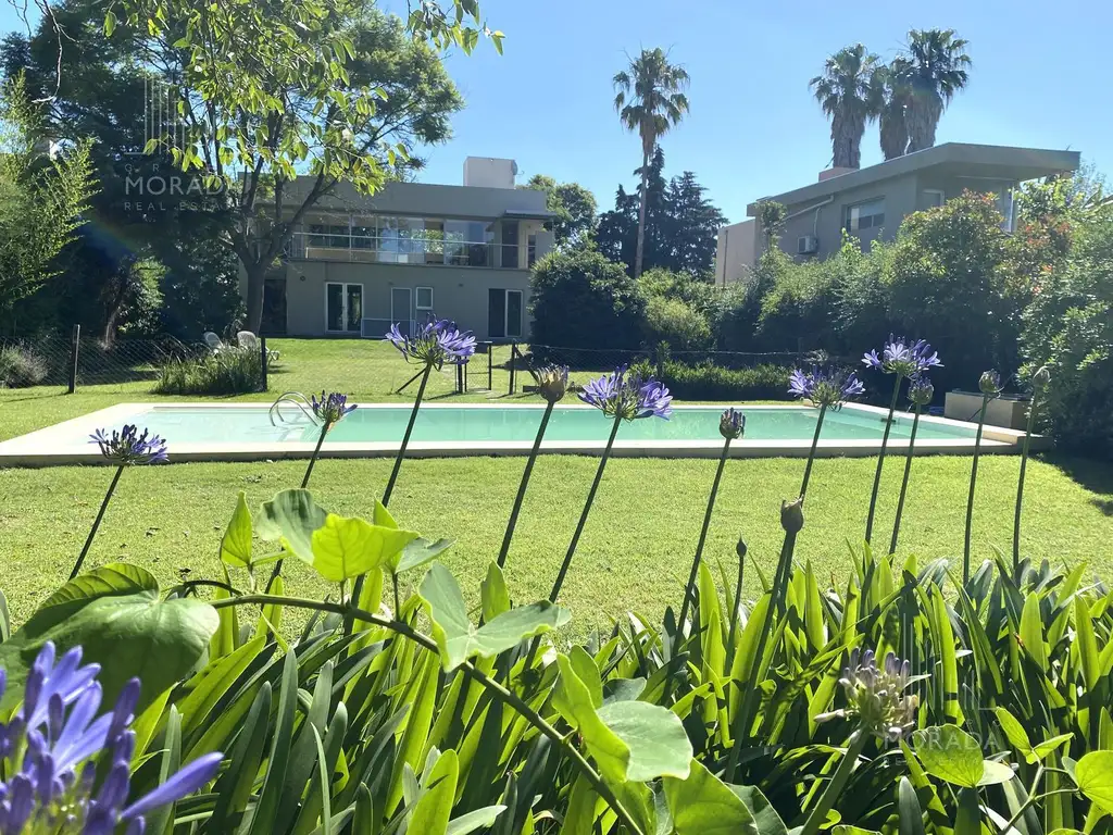 Jardín parquizado y arbolado de 874 m2. Piscina equipada con filtro automático y bomba. Parrilla exterior y cochera cubierta para dos autos.