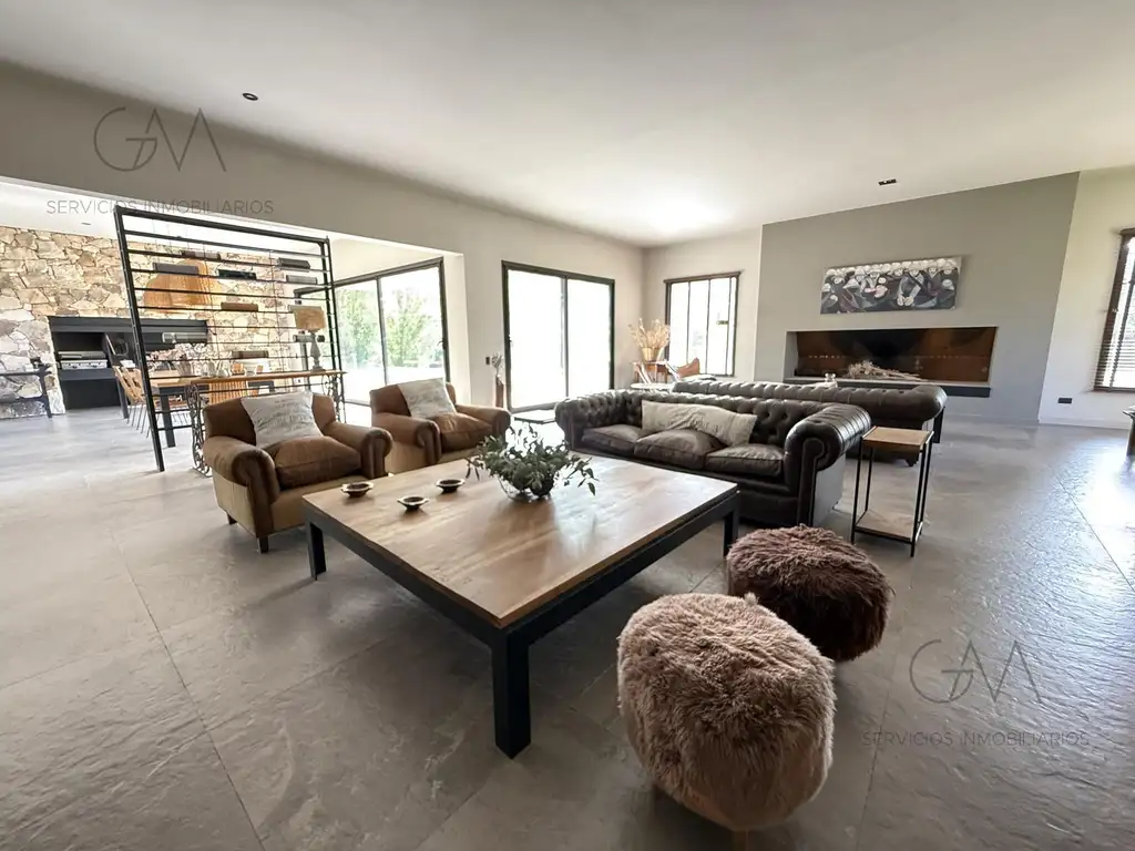 Amplio living con hogar y comedor, con grandes ventanales corredizos que integran el interior con la galería y el parque.