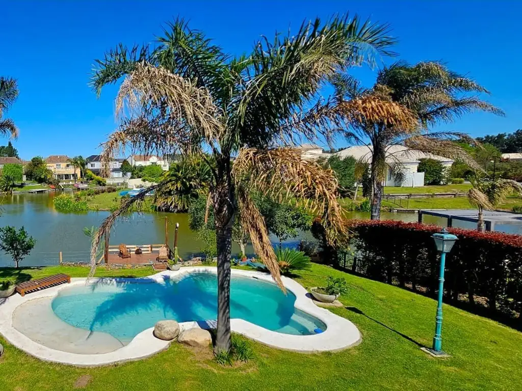 El jardín, finamente parquizado, con pileta en forma orgánica con revestimiento en blanco símil arena, fuente para peces y un muelle privado con acceso al río, invita a la relajación y el ocio. Además, cuenta con un tallercito exterior de usos múltiples.