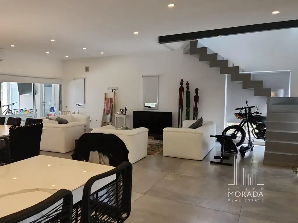 En panta baja: living comedor, toilette, playroom con smart tv 55, amplia cocina, lavadero, galerías; una con living la otra con una parrilla grande. Jardín con pileta (reposeras), fogonero y cama elástica para chicos. cochera techada para 2 autos.