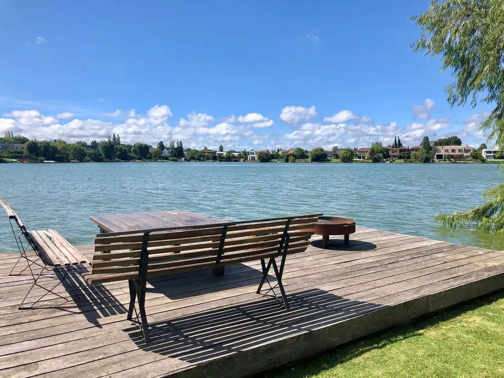 Hall de recepción que conecta con comedor principal y living con chimenea, una puerta corrediza vidriada conecta con la cocina y el family, amplios espacios , luz y vista al lago desde todos los ambientes