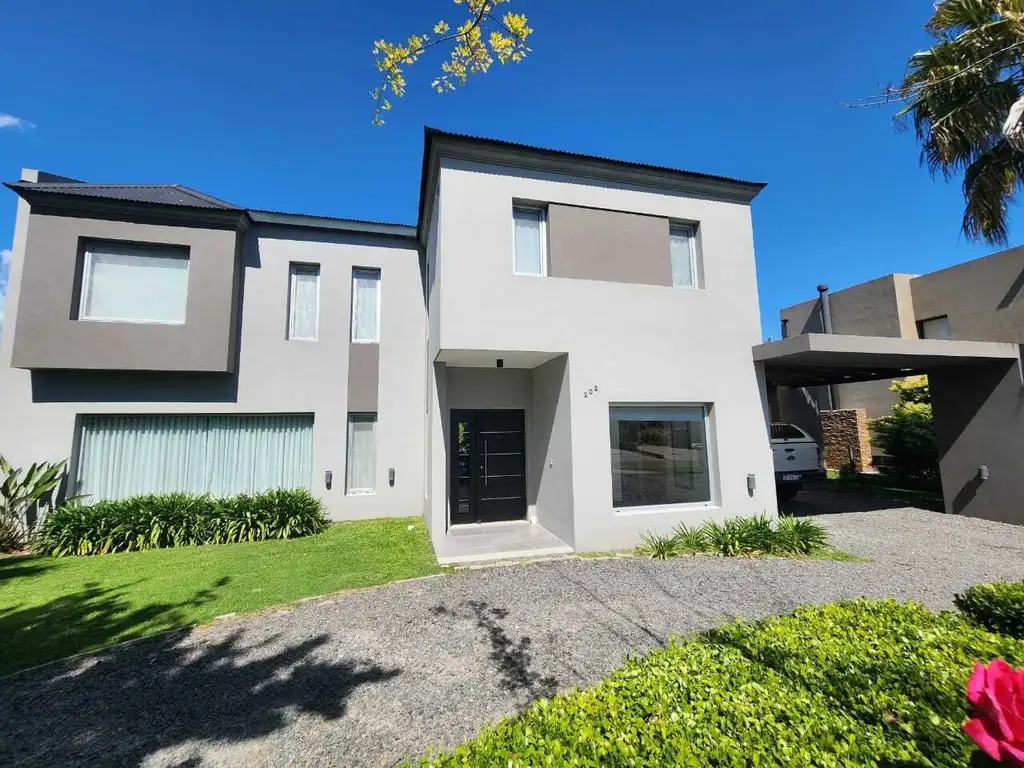 Casa 6 ambientes moderna y luminosa de 300m2 cubiertos y 60m2 semicubiertos. Se encuentra sobre un lote central de 1500m2, a sólo 100m del ingreso principal y piletas de natación, SUM y plazas.