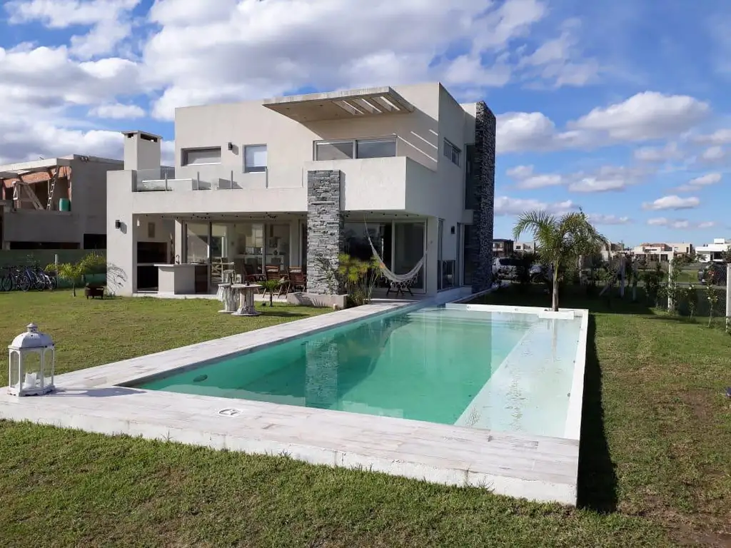 En el exterior, amplia galería con parrilla,, barra con hornallas a gas, pileta climatizada con solárium, jardín parquizado,, palmeras, riego e iluminación automáticos. .