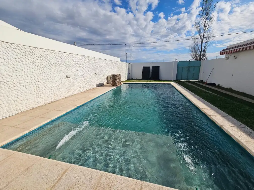 La propiedad cuenta con una hermosa piscina al frente, cochera pasante descubierta para por lo menos 3 vehículos. Posee un quincho semicubierto con amplísimo parrillero, 2 baños y un salón con cerramiento, el cual posee cocina con mesada granítica, doble bacha, muebles bajomesada en malamina negra, cocina industrial de 4 hornallas, 2 heladeras verticales y mesas y sillas (Capacidad para 50 personas)