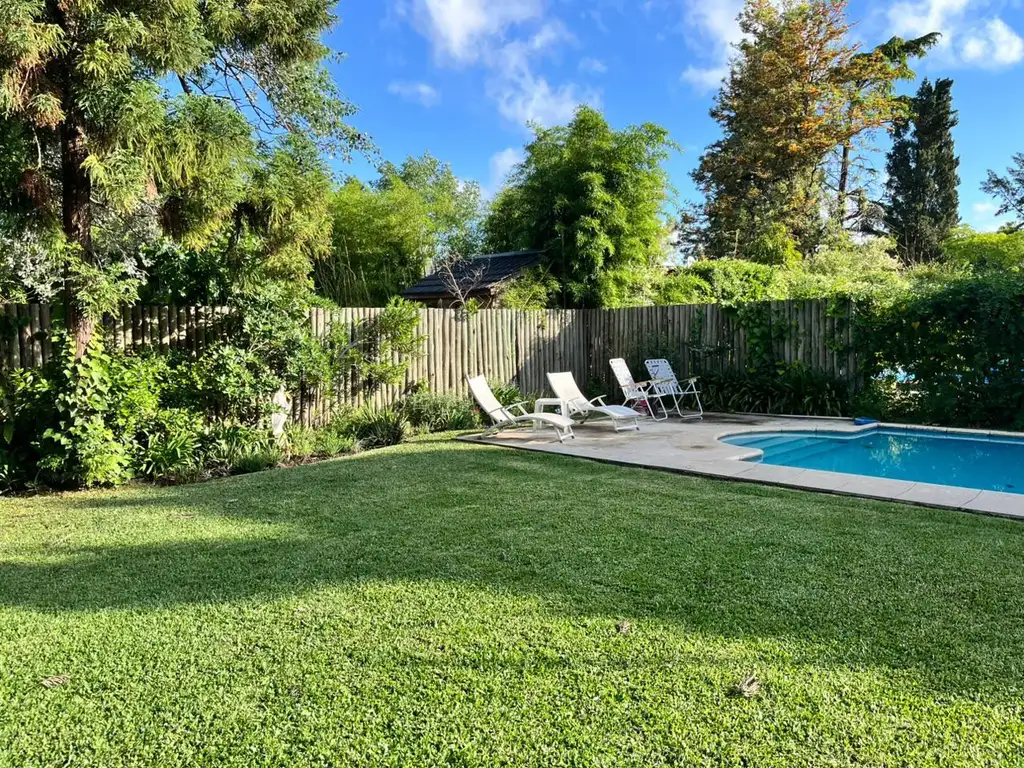 Pileta sin cerco perimetral, amplio jardín muy cuidado y fogonero.