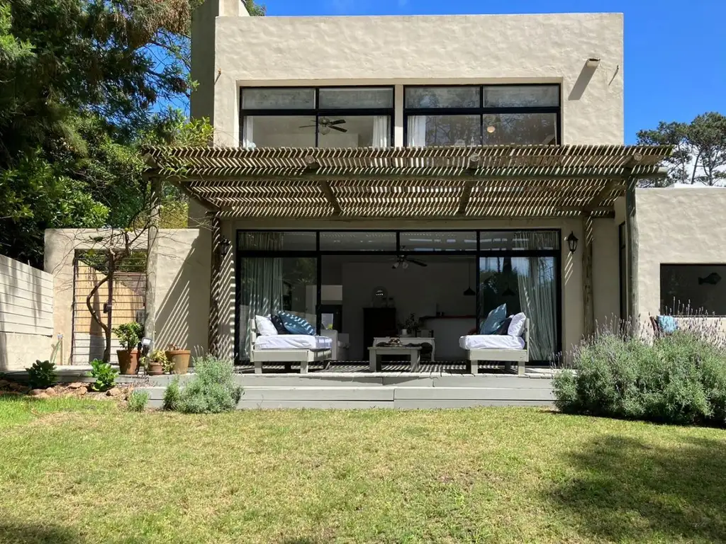 Tras una luminosa recepción con vista al patio interior, se accede a ambientes cálidos y naturales. Un living con vista al jardín integrado a la cocina tipo americana y el comedor con ventilador de techo, cuatro dormitorios, en planta baja un dormitorio en suite con cama matrimonial y aire acondicionado, un dormitorio con una cama marinera y aire acondicionado y un baño completo. En la planta alta dos dormitorios con dos cama c/u y ventilador de techo y un baño. Dependencia de servicio con baño independiente a la casa. Parrillero y estacionamiento.