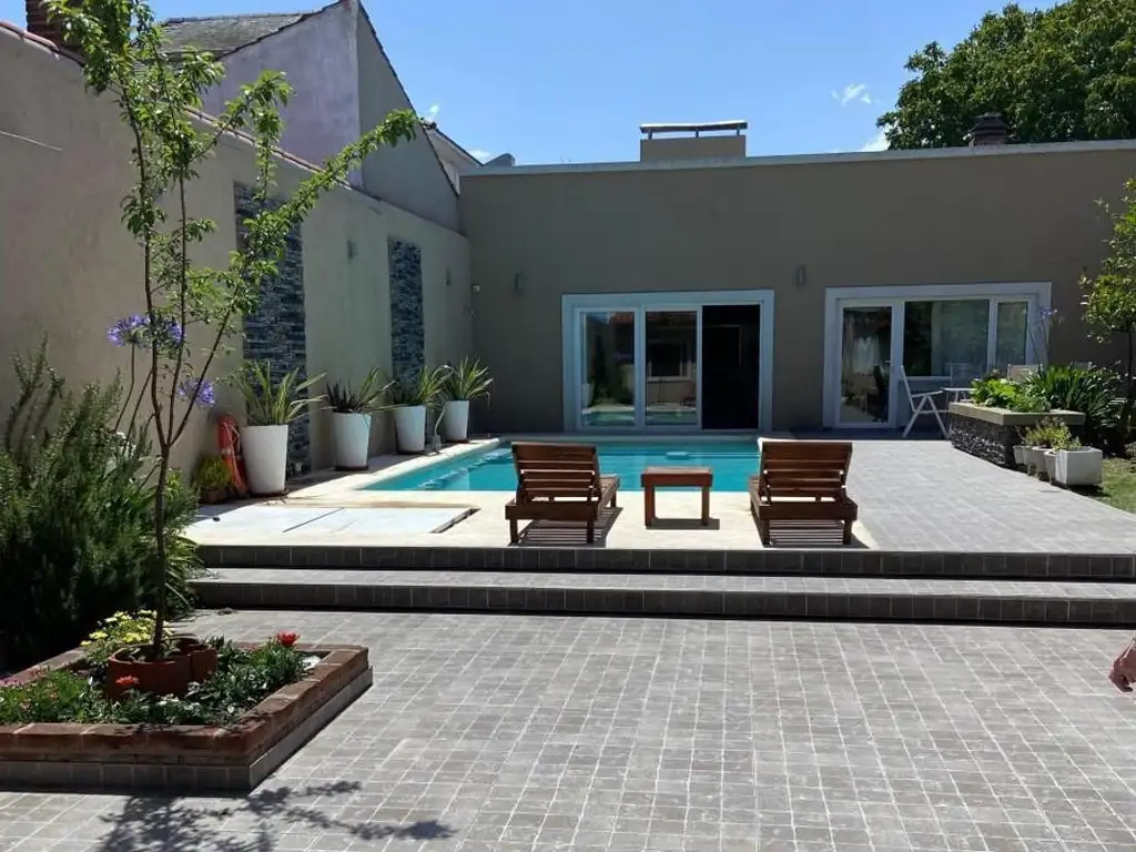Amplio patio con piscina climatizada y amplio quincho con parrilla, asador, horno a leña empotrado, barra, cava de vino, vajilla completa, heladera y freezer vertical. Proyector con pantalla gigante con directv y play station 4 . Baño completo con ducha.