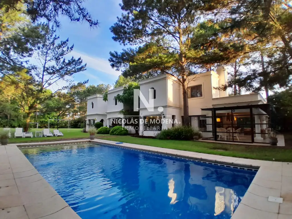 En un lote de 3400 m2 esta espléndida propiedad cuenta con un espacioso living con hogar a leña de alto rendimiento y grandes ventanales que permiten disfrutar el jardín desde el interior de la casa. Comedor diario y estar. Cinco dormitorios en suite, más toilette y escritorio. Amplia cocina definida, completamente equipada.
