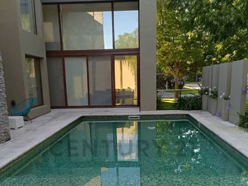- Living en doble altura con ventanales al jardín y pileta.