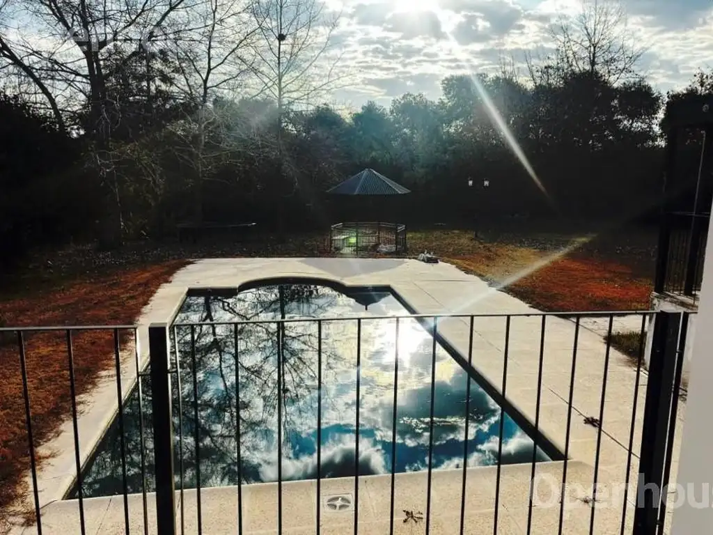 Al ingresar nos encontramos con un amplio living comedor que conecta con una gran galería semicubierta con vista a la piscina de (8 x 4 m) y con el quincho c/ parrilla anexado armónicamente a la propiedad (la misma cuenta con herrajes, mesada y bacha) este espacio dispone de un cerramiento de vidrio y madera y aluminio generando un ambiente luminoso y acogedor,
