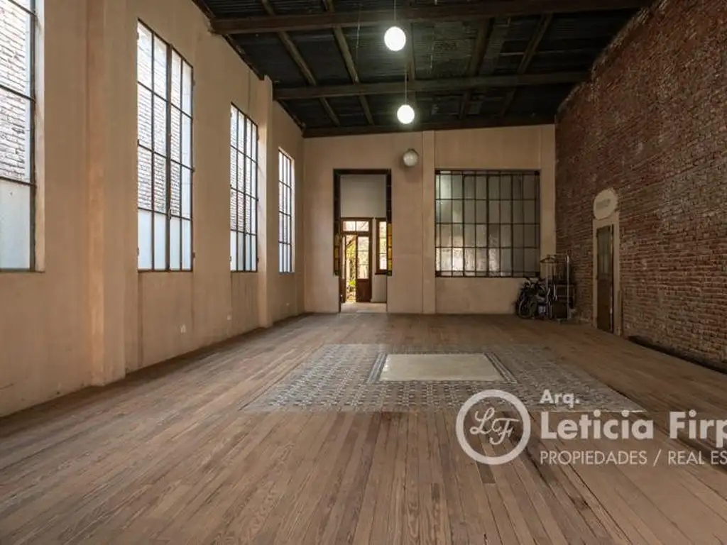 Cuenta con un gran ambiente al frente de uso flexible perfecto como espacio de vivienda, taller artístico o estudio profesional, bañado por luz natural gracias a sus imponentes ventanales de hierro y vidrio repartido.