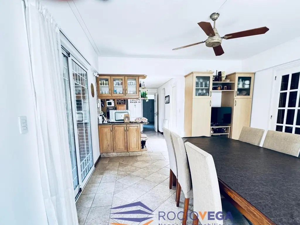 Hall de ingreso con placard de recepcion y toilette,living con hogar y vistas al jardin ,cocina comedor, lavadero que se comunica con la cochera/quincho, cerrado ,con parrilla y salamandra.