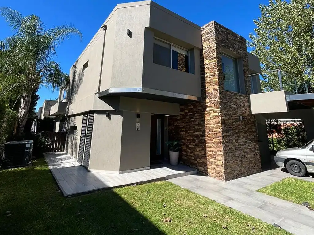 Desarrollada en dos plantas, con terminaciones, revestimientos, amoblamiento de primera linea y totalmente equipada, lista para mudarte la misma posee entrada de auto cubierta para tres vehículos, 2 descubiertos y bicicletero. Al ingreso nos encontramos con un hall de recepción con placard de cortesía , un living comedor con doble altura, cocina con amoblamientos sobre y bajo mesada con circulación doble, desde el comedor y la galería o quincho. La galería es un espacio muy bien equipado (parrilla de acero inoxidable, mueble bajo mesada, bacha, aire acondicionado) , con una vista divina al jardín con cerramientos totalmente vidriados y aberturas plegadizas. Espacio exterior muy bien ambientado, con cerco vivo en todo su perímetro, solarium, piscina climatizada con borde infinito y parrilla exterior. En planta baja se sitúa un escritorio o habitación de huéspedes y un amplio y muy moderno baño completo con ducha escocesa, además del lavadero y cuarto de maquinas.