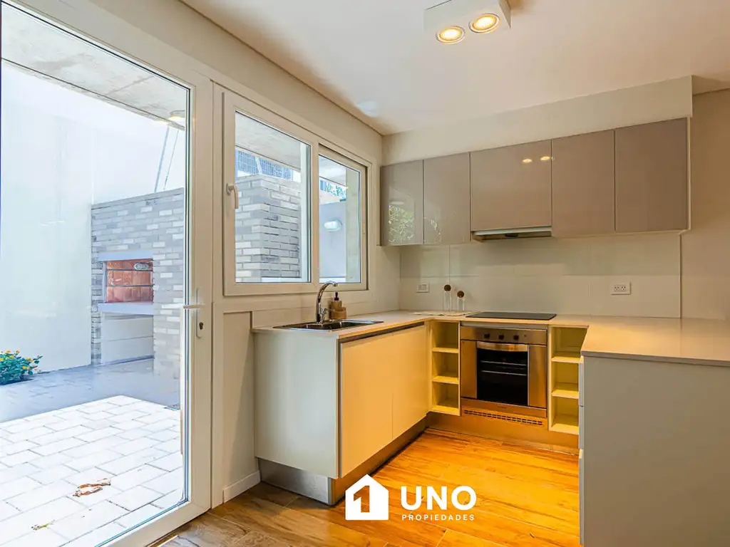 Dúplex con patio exclusivo y parrillero, a estrenar. En planta baja está el estar/comedor con Ventilación Cruzada , un toilette de recepción, cocina totalmente amoblada con doble mesada, barra desayunadora, conexión para lavarropas y salida a un patio de 16 m2 con parrillero. En la planta alta se encuentran los dos dormitorios con placard con interiores terminados y un baño con bañera.