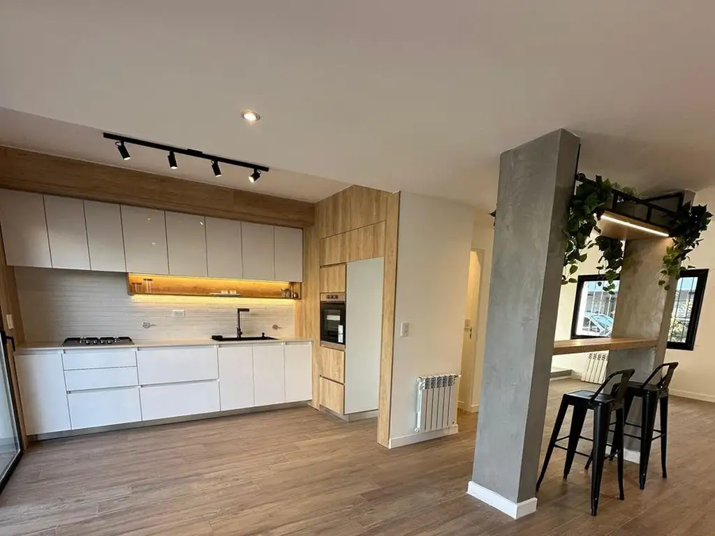 La unidad se desarrolla en dos plantas, accediendo por planta baja nos encontramos con amplio living comedor con barra desayunadora. Cocina moderna, con horno empotrado y anafe con amueblamiento a medida. La planta baja también cuenta con Toilette.