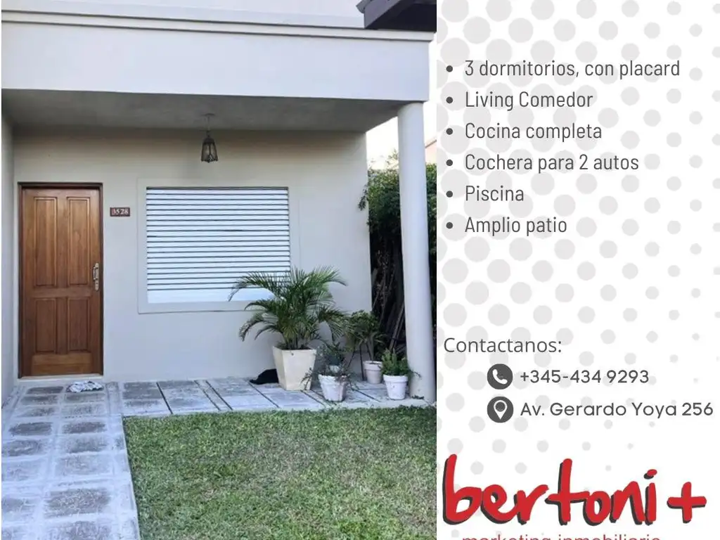 CASA EN VENTA. Humberto Primo 3528, Zona Ex Hostería San Gabriel. 3 dormitorios, dos de ellos con placares nuevos empotrados. Amplio living comedor. Cocina completa. Cochera para dos autos, una de ellas techada. Patio con Piscina. Calefactor en Comedor. VALOR U$S:130.000.-