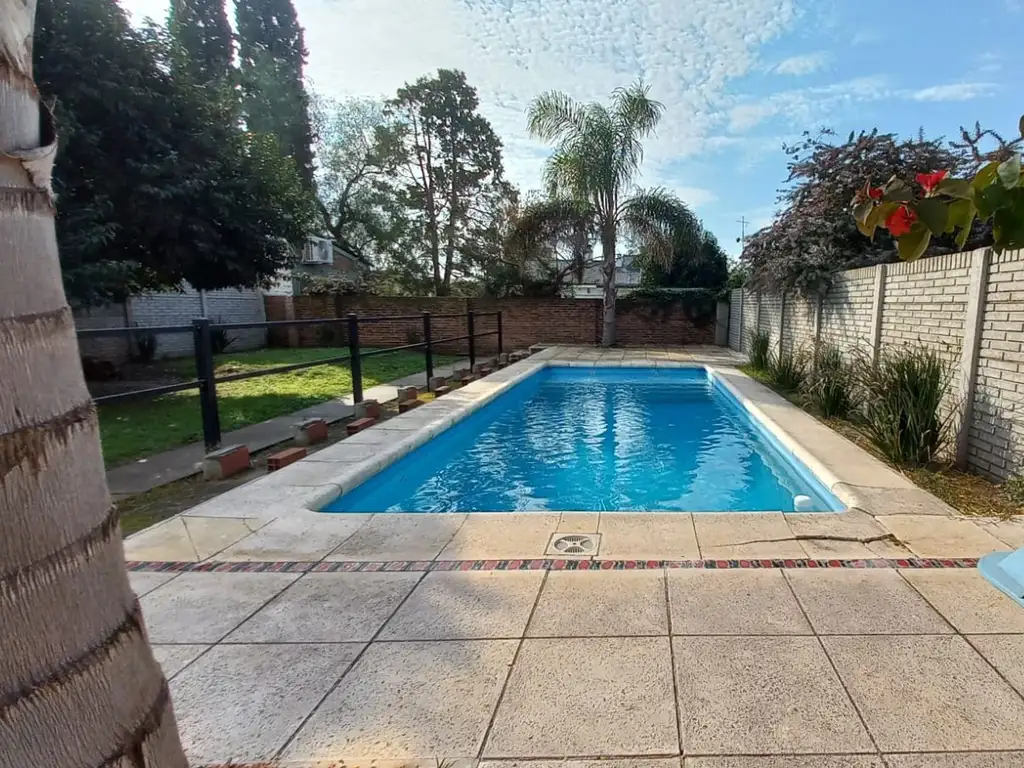 Desde la cochera con espacio para dos vehículos pasamos a un jardín de invierno cubierto y estudio que se puede transformar en quincho con vista al patio.