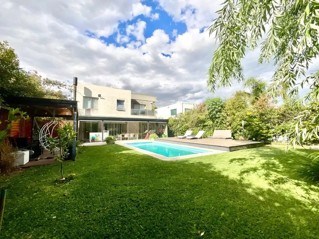 La casa se desarrolla en dos plantas, sobre un lote propio de 603 m² aproximadamente, con un amplio parque y pileta. Su buena orientación al sol asegura un ambiente cálido y luminoso durante todo el día.