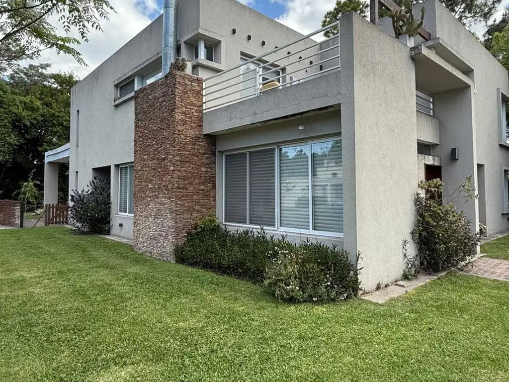 La planta baja ofrece un amplio hall de recepción que conecta con un living luminoso con ventanales y hogar, complementado por un comedor y cocina moderna con isla. Un primer dormitorio en suite con baño e hidromasaje, habitación de servicio, lavadero cubierto, parrilla techada y toilette para invitados completan este nivel. La cochera cubierta permite estacionar dos vehículos.