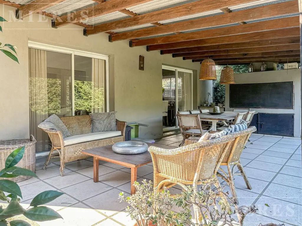 Exterior: Galería con parrilla y jardín.