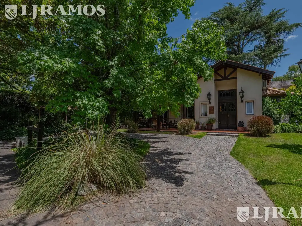 Adelante, varias posiciones para estacionar autos y uno en semi cubierto, importante porche de entrada con doble puerta de madera de demolición muy antigua, enseguida la recepción donde se desarrolla el comedor y el living en L, tiene hogar a leña, y un sector de lectura con ventanas en Bow Windows.