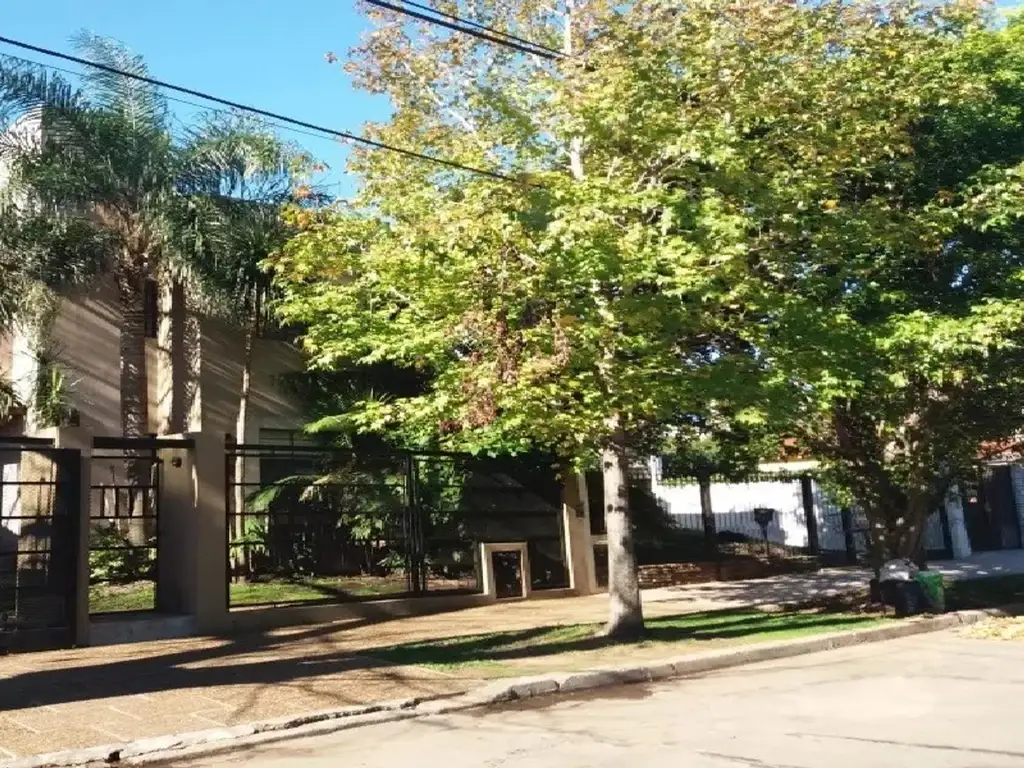 A la izquierda la cocina comedor. Girando otra vez a la izquierda, una puerta para ingresar al garage techado y escalera que conecta a la planta alta con un pasillo que conecta 2 habitaciones amplias, una de ellas con balcon que da la vista completa de todo el parque y la otra con vista al frente. Ambas muy luminosas. Un ante baño seguido de un baño completo. Volviendo a la planta baja, saliendo de la cocina estamos en un nivel donde está la parrilla y bajando un escalón una pileta grande con un parque enorme, que a su fin nos recibe la entrada al quincho muy amplio, con 3 puertas. La primera conecta al living del chalet. La 2da a un cuartito de servicio. La 3ra a un pasillo donde tenemos acceso a otro baño completo y a la cocina comedor del chalet. Dónde también hay una escalera caracol que nos hace subir a una habitación con un Placard.