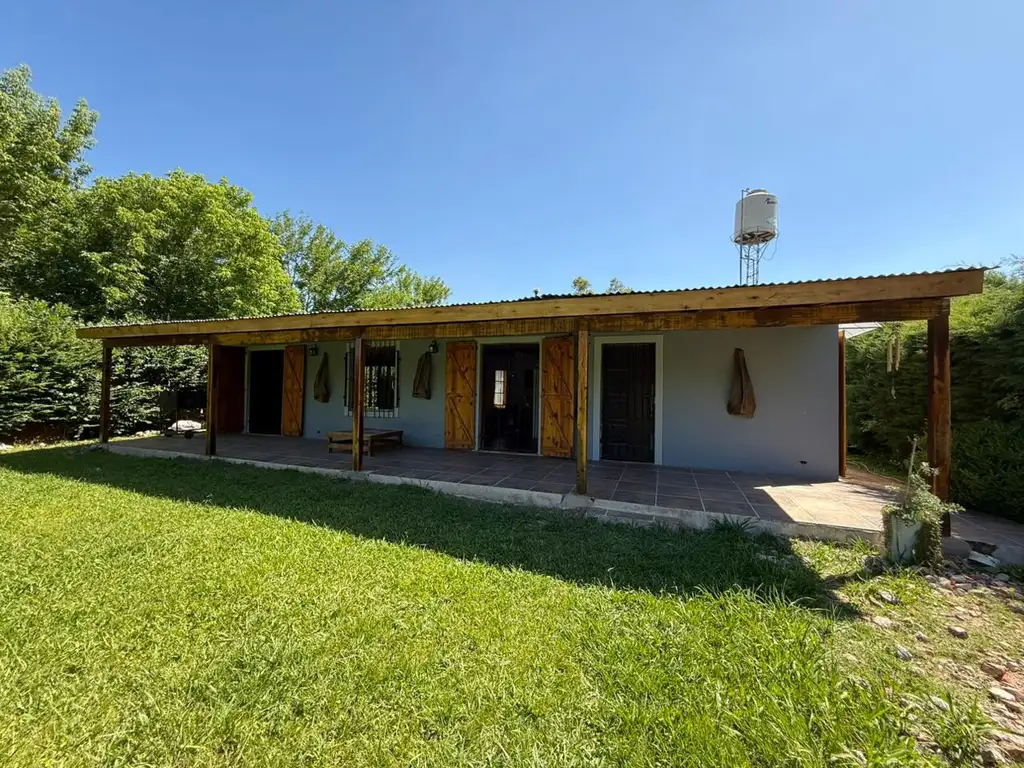 La casa ofrece un amplio living comedor con salamandra a leña, aire acondicionado y ventilador de techo. La cocina integrada, amoblada y con barra desayunadora aporta practicidad al espacio.