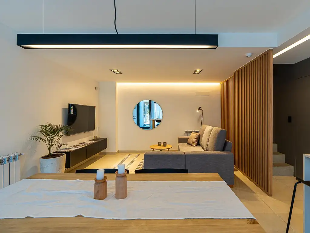 P.B: Jardín exclusivo con pileta de 2,80 x 1,80 y solarium, parrillero y mesada con bacha incorporada. Ingresamos a la propiedad y nos encontramos el estar con comedor diario y un gran ventanal hacia el jardin, cocina integrada con muebles bajo mesada, alacenas y barra desayunadora. Toliette y escalera.