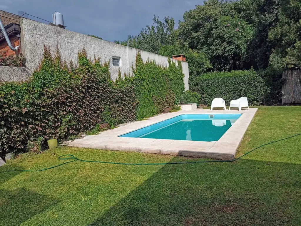 Avanzamos a la parte de atrás y encontramos una gran pileta con parque y plantas, un toilette y un cuarto de guardado.