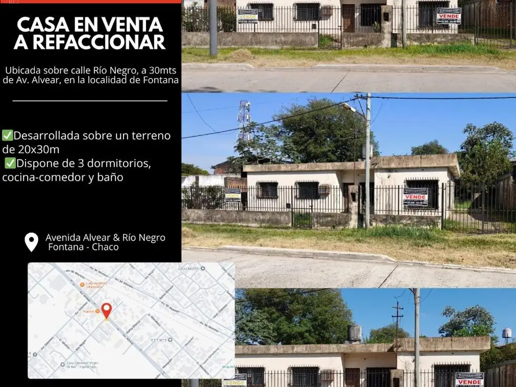 Propiedad ubicada sobre calle Río Negro, a solo 30 metros de Av. Alvear, en la localidad de Fontana, con excelente accesibilidad y entorno consolidado.