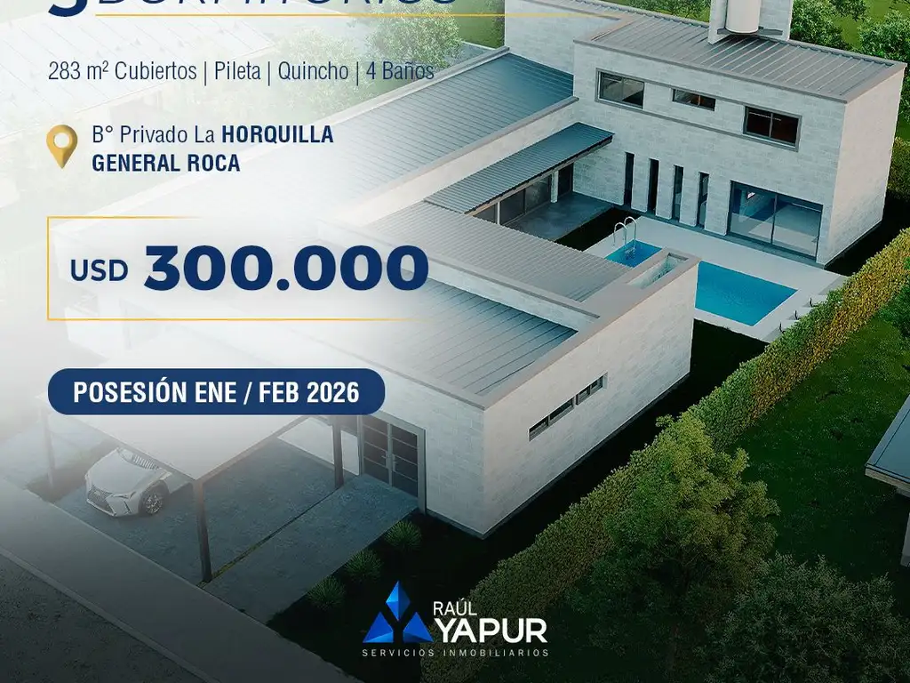Acceso principal jerarquizado conexcelente visual y carpintería en aluminio negro.Living comedor de grandes dimensiones, con ventanales amplios, que conectan al parque y piscina.Cocina integrada con isla central, mesadas en piedra natural, equipada con cocina industrial, mobiliario bajo mesada.Parrilla interior en cocina-comedor con salida al quincho.Quincho cubierto con parrilla adicional, mesada con bacha y baño propio.Dormitorio principal en suite, con vestidor, baño completo con ducha escocesa, grifería negra y sanitarios línea Ferrum/Pringles.Antebaño y baño social para visitas.LavaderoEspacio para gimnasio / sala multifunción adaptable.Cochera Semicubierta para dos vehículos.