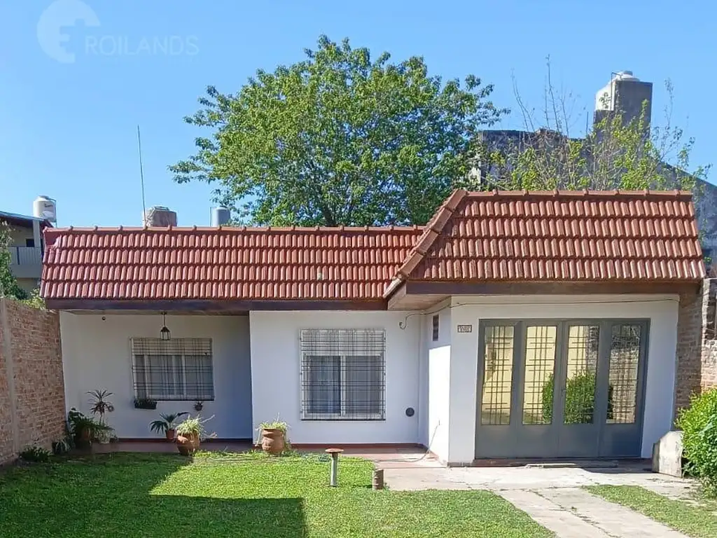 La casa posee techo de losa con frente de teja, brindando solidez estructural y un estilo clásico.