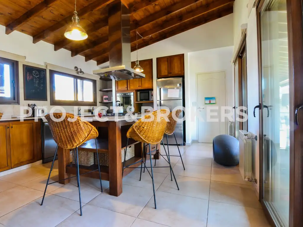 Casa con cuatro dormitorios y tres baños en un nivel con enormes ventanas de piso a techo que dan mucha luz natural. La casa tiene un gran living y una cocina con acceso al exterior donde hay una piscina y exuberantes jardines. Tiene vistas abiertas en un entorno tranquilo y residencial. Esta casa tiene una ampli galeria quincho diseñadas para adaptarse a la comodidad de la propiedad muy moderna y encantadora.