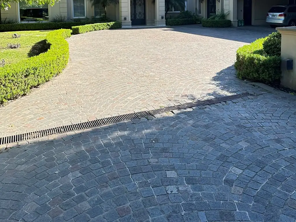 En Exterior: 2 importantes Galerías semicubiertas, una con baño de exterior y parrilla y la otra a continuación del living. Piscina de 50 m 2 azulejada, iluminada y climatizada. Garage semicubierto para 4 autos, importante playa de estacionamiento con pisos de pórfido.