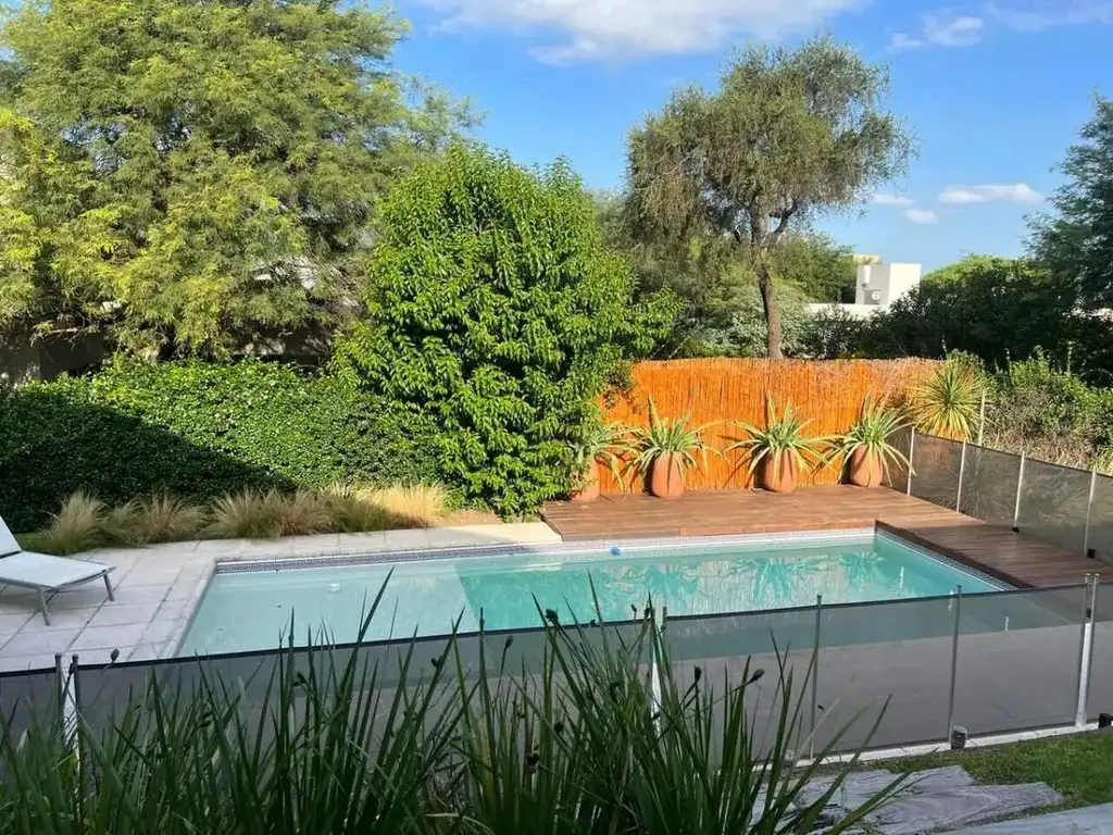 Piscina con solárium, integrada al jardín plano y parquizado.