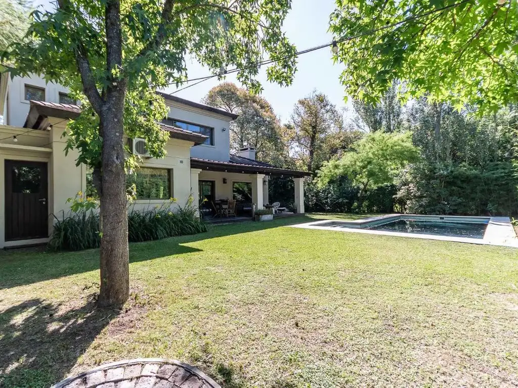Amplio jardín parquizado, pileta de excelentes dimensiones , ubicada en un sector soleado. Extenso sector de césped y una arboleda consolidada que enmarca toda la vista, aportando privacidad y un entorno natural inmejorable. La vegetación incluye árboles adultos, plantas que crean un ambiente verde, fresco y muy agradable.