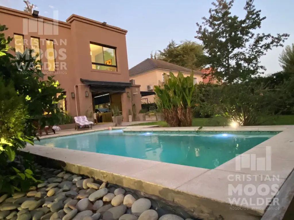 Porche, hall de entrada, imponente living comedor con techo en doble altura, cocina semi integrada , lavadero, toilette de recepción. Galería con parrilla y mesada con bacha, cerramientos completos con aire acondicionado frío-calor, ventilador de techo y toldo plegable -brazo invisible-. Garage para 4 autos (3 quedan cubiertos).