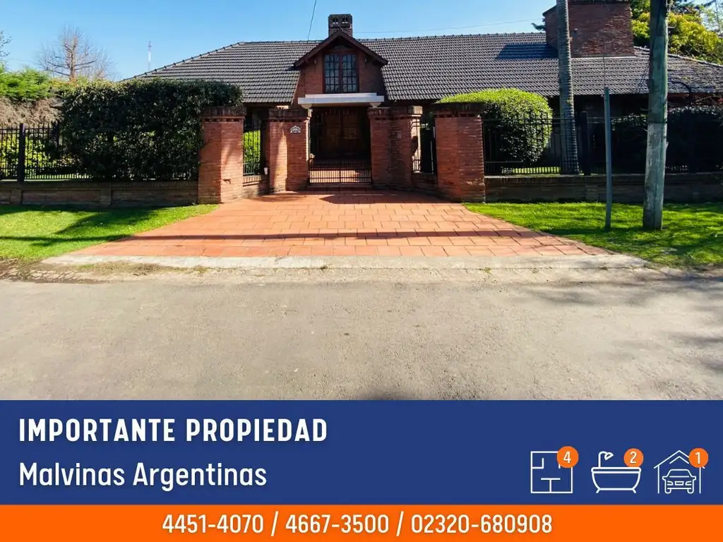 CASA DE 4 AMBIENTES DE APROX 320M2 EN DOS PLANTAS SOBRE UN TERRENO DE APROX 2000M2. CUENTA CON UNA COCINA CON ISLA, UN COMEDOR, LIVING CON HOGAR, 3 DORMITORIOS EN PLANTA BAJA, 1 ESCRITORIO, 1 BAÑO COMPLETO CON BAÑERA CON HIDRO EN SUITE, Y UN BAÑO COMPLETO COMPARTIMENTADO,2 TOILETTES (UNO EN PLANTA BAJA; EL OTRO EN PLATA ALTA -SIN TERMINAR-), CALDERA CENTRAL, QUINCHO CON PARRILLA Y BAÑO, PILETA DE 11MTS X 6MTS, COCHERA, PORTON MANUAL.