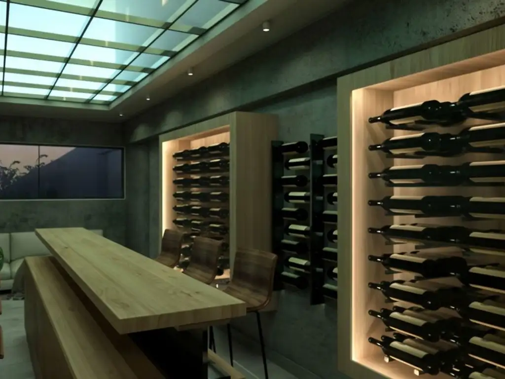 Dispuesta en 2 plantas en su planta baja encontramos Cava subterránea perfecta para reuniones de los amantes del vino, cochera con galería y parrilla, vistas que se abren al jardín espectacular, cocina comedor, living, toulet para invitados, en la planta alta se desarrolla la habitación principal con baño y vestidor, escritorio, 2 amplias habitaciones con baño y un gran ambiente que puede ser desarrollado para gimnasio o playroom.