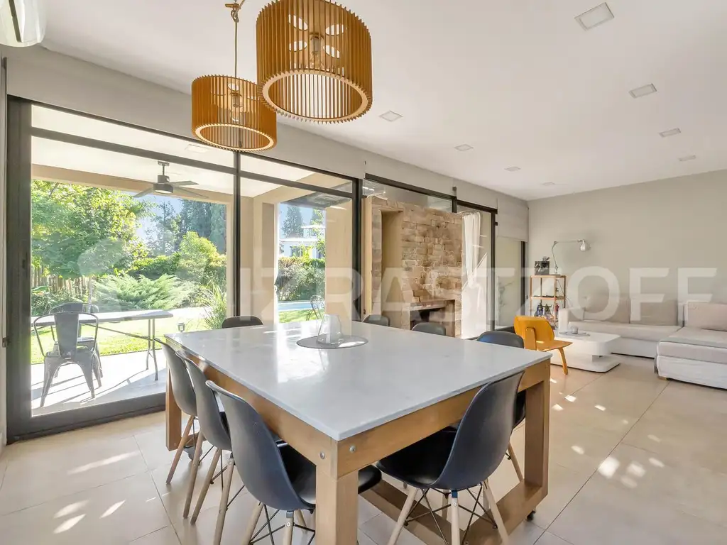 Se ingresa a la casa por el living que posee un muy lindo hogar a leña con leñero, revestido en piedra natural y gran vista abierta a la galería y jardín. Comedor integrado a la cocina, la cual tiene un estilo moderno y es muy cómoda: posee amoblamiento alto y bajo mesada con guías telescópicas. Isla o espacio desayunador. Horno eléctrico empotrado de acero inoxidable y extractor marca Domec. Anafe a gas. Mesadas de Silestone color blanco norte. Bacha de acero inoxidable marca Johnson. Espacio para el lavavajillas. Lavadero independiente con su respectivo amoblamiento, y lugar para tendido de ropa y acceso desde el exterior. En el sector íntimo de la casa, master suite con baño compartimentado y vestidor. Dos cuartos con buen placard con sus interiores. Baño completo que los asiste. A la planta alta actualmente se accede por el exterior (pasible de modificación). Allí hay un espacio de 44 metros multifunción, apto para cualquier uso que se le quiera dar (gran oficina, atelier, dos cuartos de excelente tamaño cada uno, playroom, etc). Existe también la posibilidad de dividir el lugar, ya que posee varios ventanales con lo cual tendría luz natural y ventilación. Dos terrazas muy lindas con piso de microcemento.