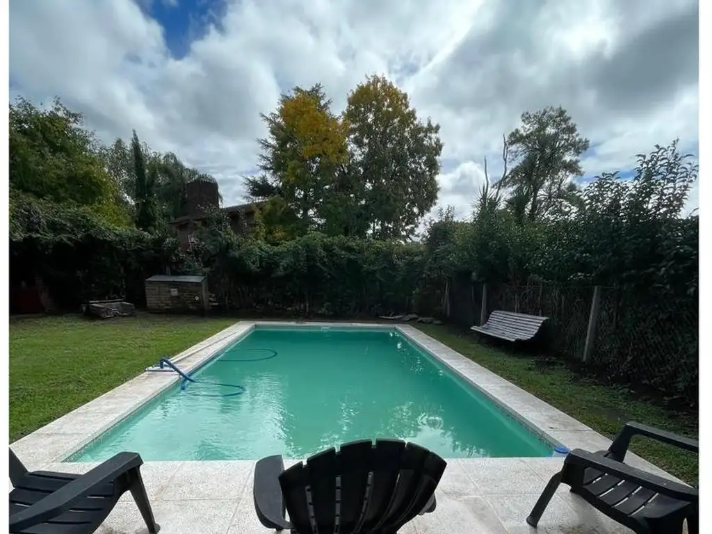 En el exterior, la casa dispone de galería semicubierta con parrilla, jardín parquizado, pileta, cerco y cochera. También cuenta con quincho y baño, riego por aspersión y filtro automático en la pileta.