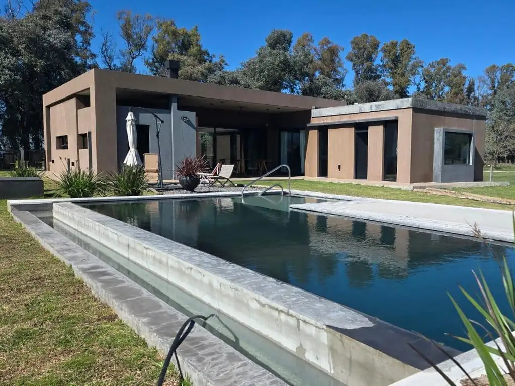 La casa está construida bajo un concepto moderno de hormigón de estilo minimalista, tiene aberturas con dvh, y pensada en espacios comunes y divisibles para una mejor climatización, una chimenea separa y conecta el living y dormitorio principal.