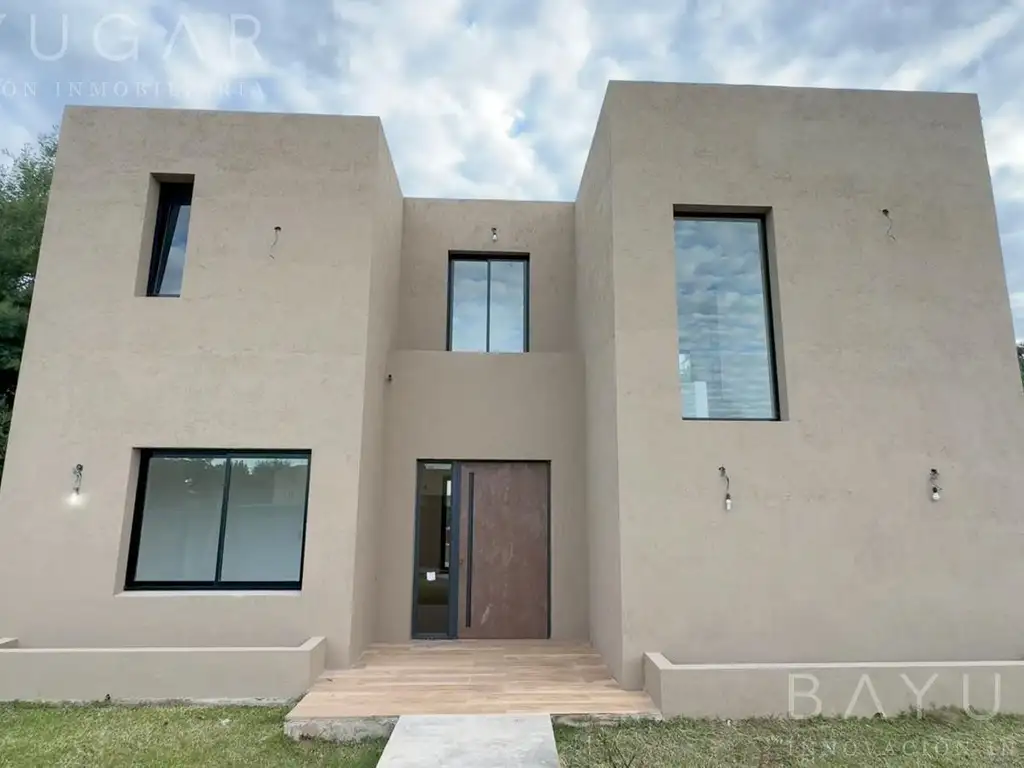 La casa tiene 3 dormitorios en planta alta, el cuarto principal en suite con vestidor y un escritorio en planta baja. Living comedor luminoso, cocina integrada. Lavadero independiente. En el exterior, galería, y pileta.